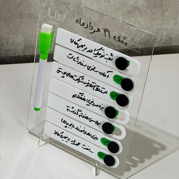 نوتیک یک ابزار کاربردی برای برنامهریزی روزانه و مدیریت روتینها است که با طراحی مینیمال و ساختار مقاوم از جنس پلکسی تولید شده است. این محصول دارای ۷ جای خالی برای ثبت کارها و تیکهای مکانیکی واقعی است که تجربهای ملموس از پیشرفت و انجام کارها را ایجاد میکند. امکان نوشتن با ماژیک وایتبرد قابلپاک شدن، استفادهی چندباره و نصب در موقعیتهای مختلف، نوتیک را به انتخابی کارآمد برای خانه و محل کار تبدیل کرده است. برای حفاظت از سطوح فلزی، پشت مگنتها محافظ ضدخش شفاف نصب شده تا هنگام استفاده روی یخچال یا سطوح مشابه، آسیبی ایجاد نشود. این محصول همراه با پایه رومیزی پلکسی شفاف ارائه میشود تا علاوه بر نصب مگنتی یا دیواری، قابلیت استفاده روی میز کار یا میز مطالعه نیز فراهم باشد.